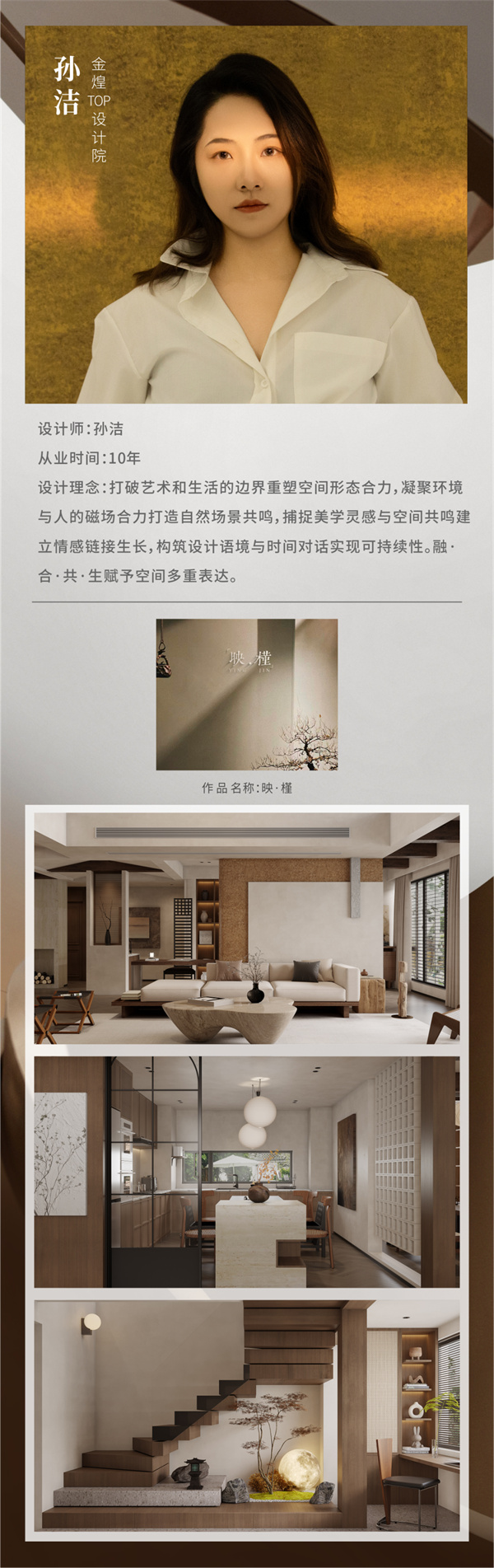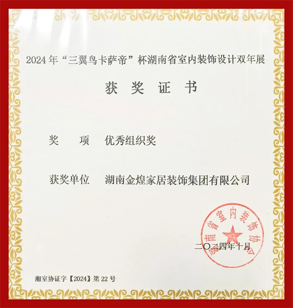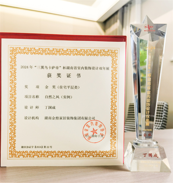 本次大赛以“绿色潇湘·幸福湖南”为主题,金煌设计总监丁国成设计的住宅项目《自然之风》,金煌TOP设计院孙洁设计的麓云国际别墅项目获得金奖;金煌首席设计师郑全禧设计的会所项目九韵台球俱乐部获得铜奖;孙洁设计的住宅项目《映•槿》获得优秀奖。橙果墅装主理人孙香设计的住宅项目《幽幽岁月》获得金奖,《明暗至简》获得铜奖。金煌也喜获优秀组织奖。