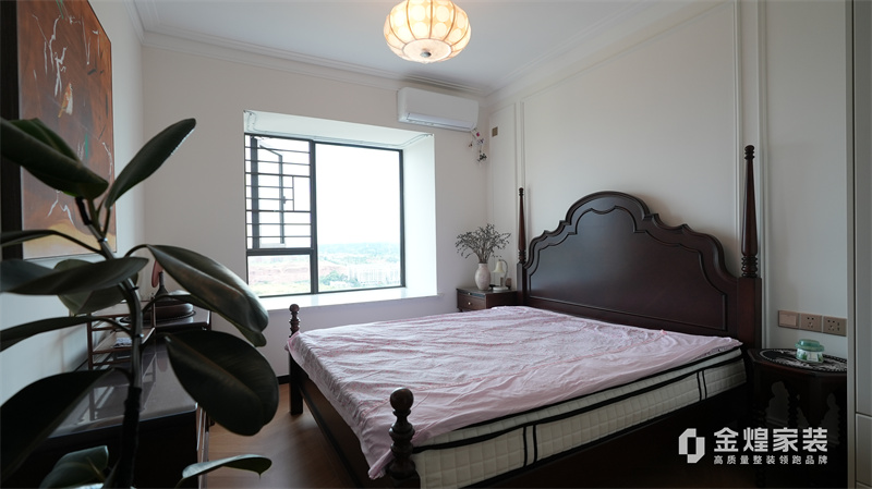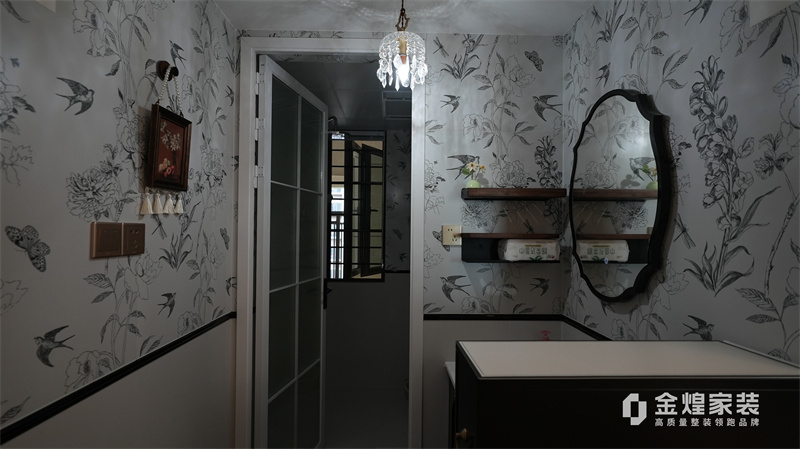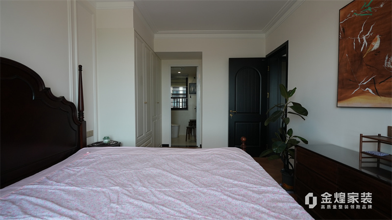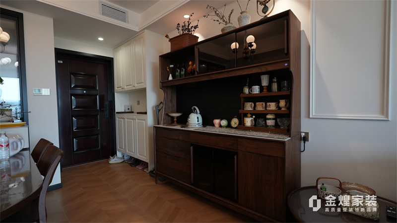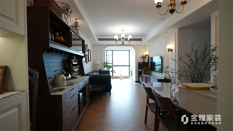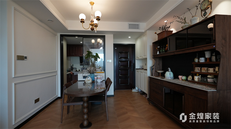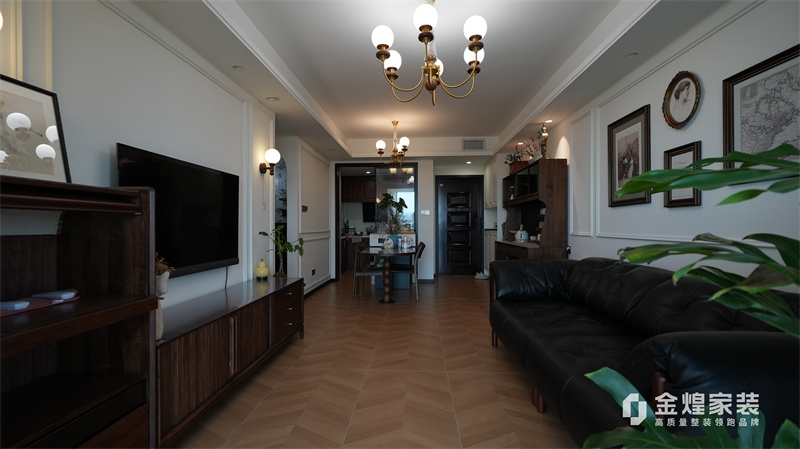 从客厅的深色皮质沙发、木质电视柜,到餐厅的玻璃餐桌、深色餐边柜,再到卧室的白色衣柜、深色木质床,都体现了中古风格对材质和色彩的选择偏好。