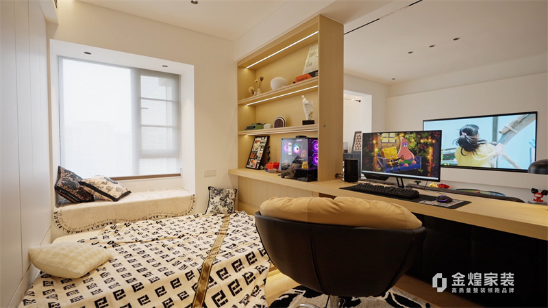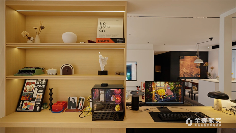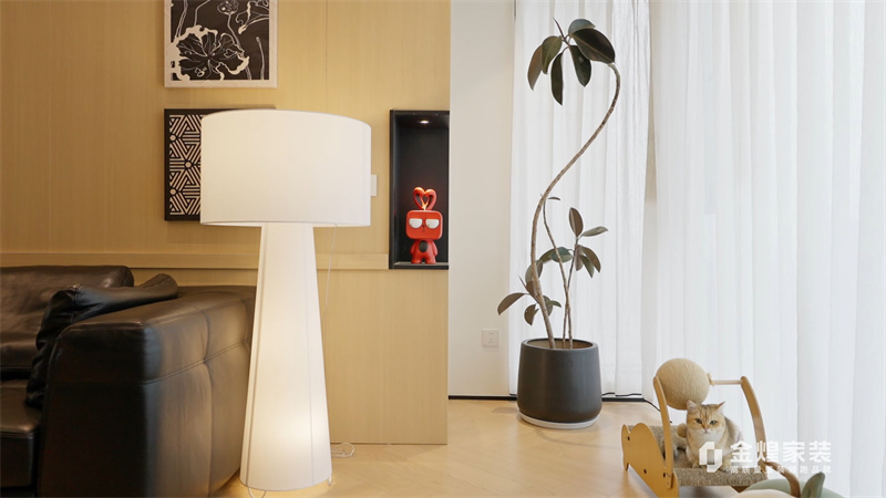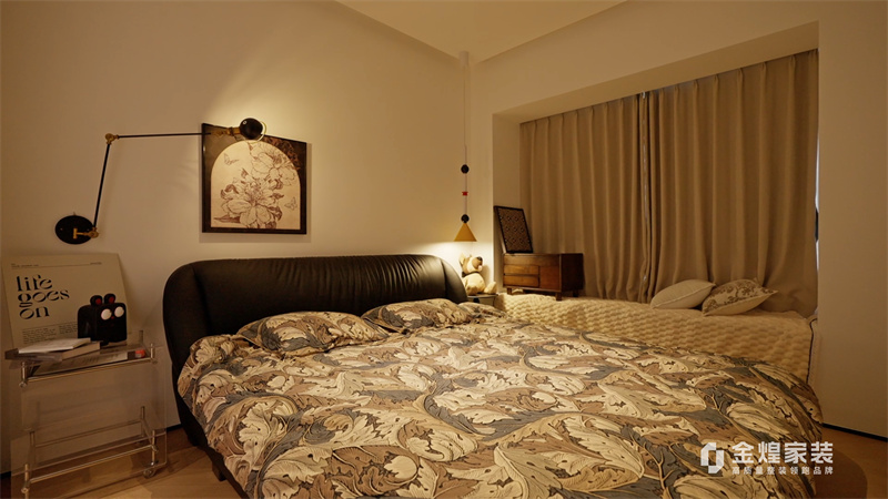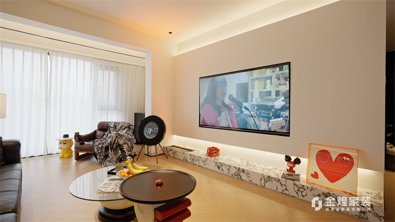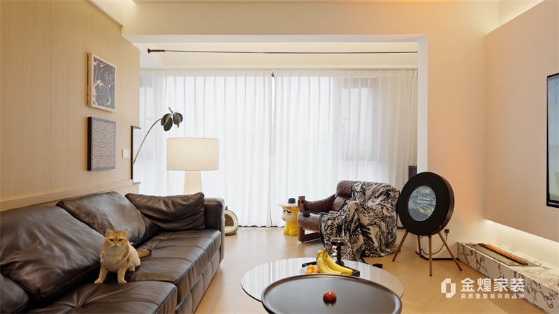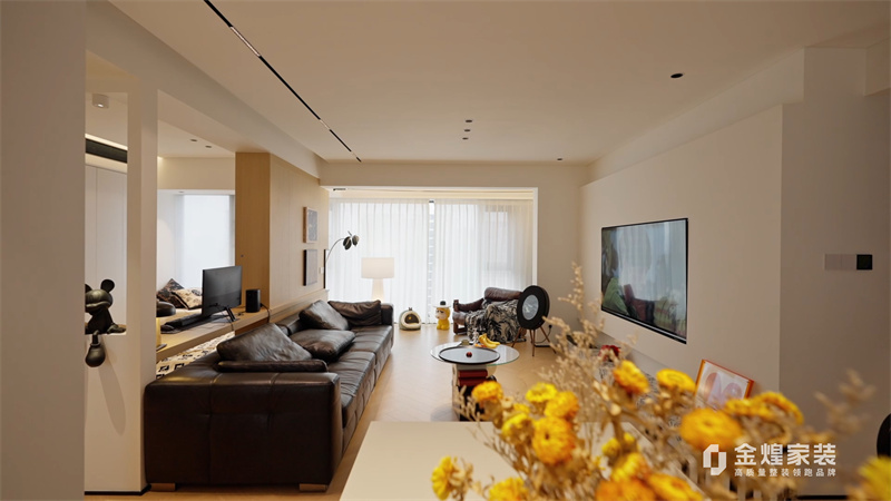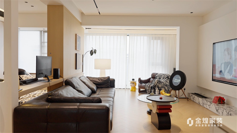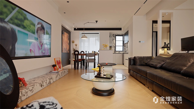 这套案例是现代中古混搭风格。整体色调以浅色为主,搭配深色家具,营造出简洁而不失温馨的氛围。客厅的布局开阔,沙发、茶几和电视的摆放合理,既美观又实用。
