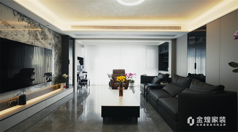 电视背景墙的大理石纹理、简洁的家具线条以及精心布置的灯光设计,都体现了现代轻奢风格的特点。同时,通过添加一些鲜花和装饰品,增加了空间的温馨感和生活气息。