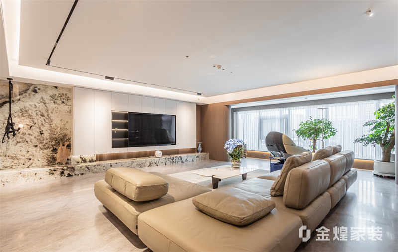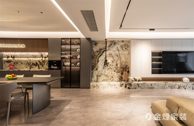 该设计以无主灯设计、岩板与木作结合,打造通透大气的现代轻奢大平层,兼具质感与生活温度。