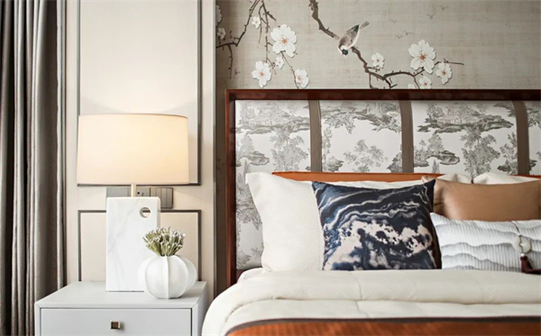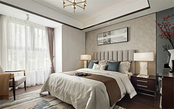卧室的色彩以柔和、舒适的中性色为主,营造出宁静、放松的氛围。床头做了大块装饰背景,再搭配温馨质感有格调的软装布置,拉开空间的层次感。