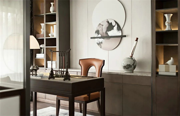书桌和书柜是书房的核心装置,沉稳的木质书桌与原木书柜展示了东方文化的深厚底蕴。书桌上的文房四宝、书柜上的古典书画和瓷器既点缀了空间,又表达了主人对传统文化的热爱。