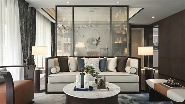 沙发墙在硬包基础上加入诗意背景画面,搭配新中式的沙发,侧边配上坐椅、盆栽绿植的布置,使得整个客厅充满着儒雅端庄的氛围气息。