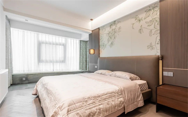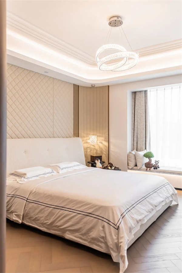 卧室的设计上用了简约的线条为核心元素,意式轻奢风在讲述真正的永恒经典,柔软的床和精致的床头装饰营造出豪华的感觉,搭配丝绸质地的床品和柔和的色彩,营造出温馨而舒适的睡眠环境。