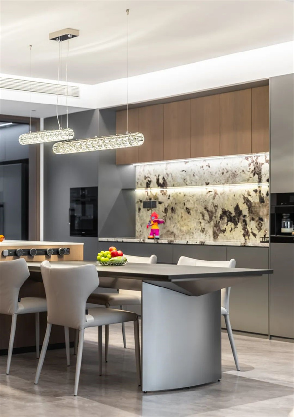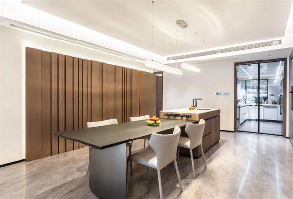 意式轻奢餐厅强调用餐空间的舒适和尊贵感。现代风格餐桌和餐椅搭配岛台,加上一侧的定制酒柜,错落有致地摆放着各式美酒与精致酒杯,打造出一个与家人和朋友共享美食的完美场所。