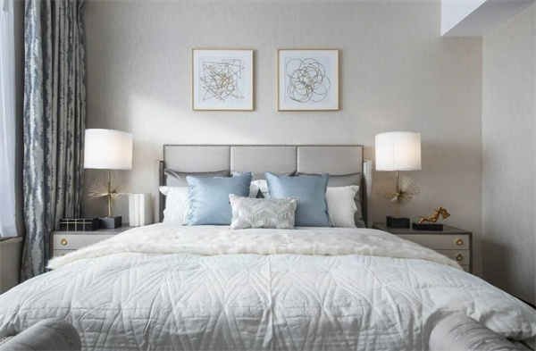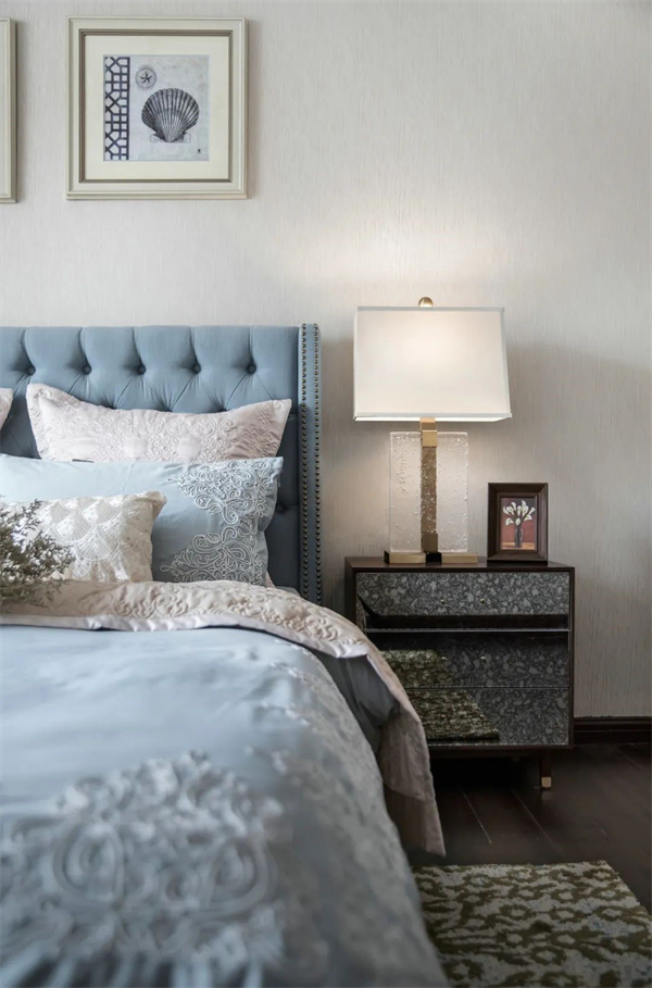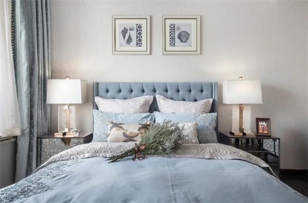 主卧中,优雅与奢华交织成了一幅梦幻的画卷。房间的主色调为柔和的米白色和天蓝色,床头采用软包设计,床上铺设着丝绸质地的天蓝色床品,柔软而光滑的触感让人沉醉其中,与花卉相互辉映,彰显出典雅与细腻。