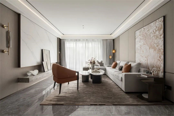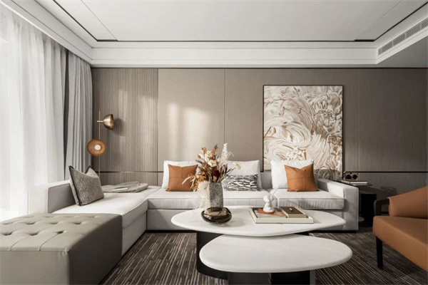 在客厅的设计中,采用简约的家具和装饰品,搭配简约风格的艺术装饰和照明灯具,选择中性色调和柔和的色彩搭配,营造出轻松宜人的氛围。同时,充分利用空间,确保流线型布局,使客厅显得更加开阔和通透。