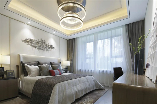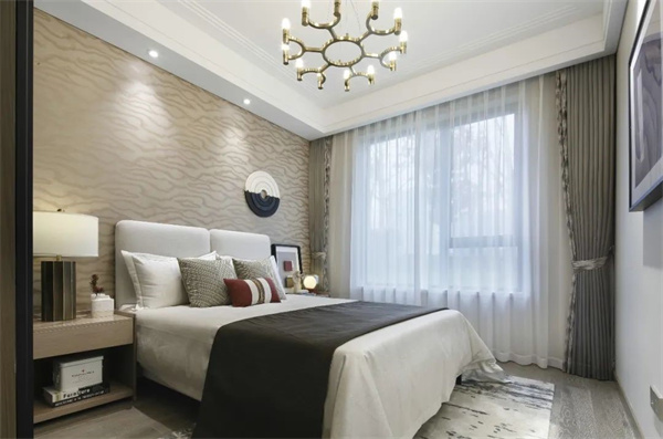传统的中式元素与现代的简约设计完美结合,呈现出典雅与舒适的空间氛围。床头背景设计了一幅大型艺术背景装饰,为整个房间增添了一份艺术气息。大窗户让自然光线充盈房间,这样的主卧空间,不仅是休憩的港湾,更是文化与现代生活的完美融合。