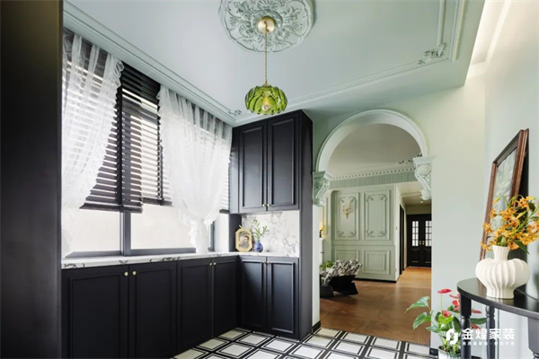 橱柜采用全定制化设计,柜门搭配精致的黄铜拉手,彰显出古老的复古风格。自然光透过窗户洒入,使整个空间更加通透明亮。现代化的厨具隐藏在复古风格的橱柜中,既保留了设计的纯粹性,又确保了现代烹饪的便捷性,仿佛在这个空间中,法式复古的优雅与生活和谐共生。