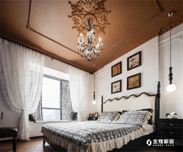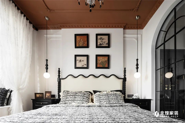 主卧延续了整体的色系搭配法则,大面积巧克力色墙顶搭配精致的空中吊灯,让整个空间看起来复古又慵懒。背景墙采用款式简约的石膏线条,恰到好处地增添了精致感。精致的软装布置,让每个角落都融入高贵与温暖,仿佛置身于巴黎的浪漫宫廷。