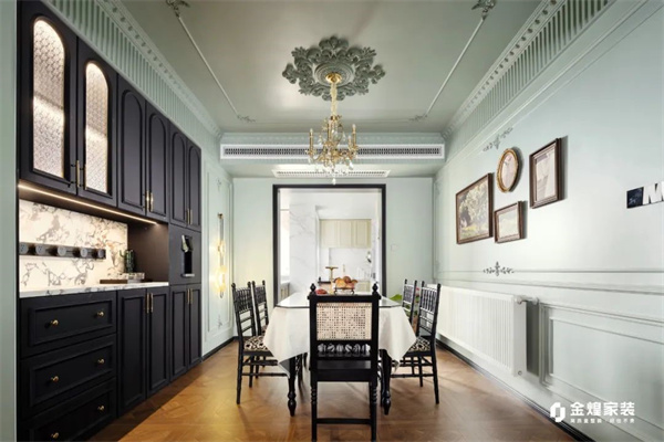 餐厅考虑到收纳需求,定制了整排收纳柜,承担了收纳+餐边柜功能。精致的餐桌椅,以柔和的廓形和雕花细节彰显出优雅的风格。装饰画的复古图案和金色镜框为空间增添一丝艺术氛围,让每一餐都宛如置身法式古典宫殿般,充满仪式感与浪漫情调。