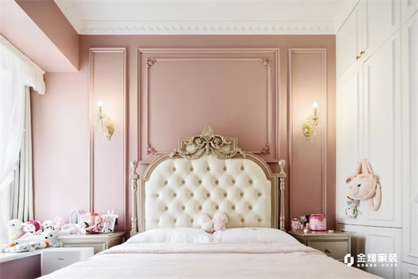 粉色成为儿童房的主调。精致的法式线条,细腻的雕花与粉色背景相得益彰。公主床的弧形设计与细腻的雕饰让房间充满了浪漫的童话气息。柔和的光线透过窗帘洒入,整个空间仿佛是一个温暖、充满想象力的粉色世界,既优雅又充满童趣。