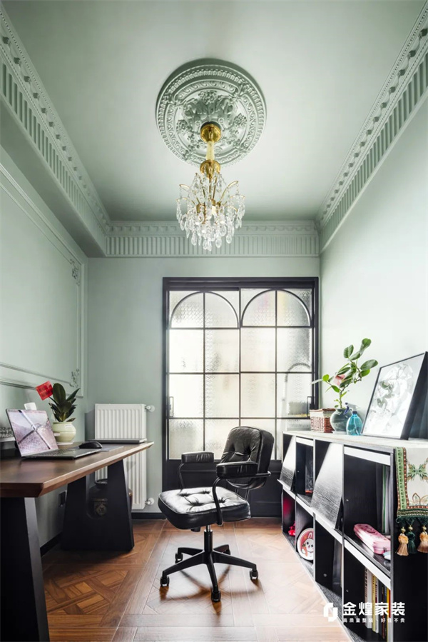 书房在法式复古风格的演绎下,散发出浓厚的文化气息与艺术氛围。深色实木书桌搭配精美的书架,呈现出稳重而优雅的格调。而复古的落地窗设计则赋予空间一份私密与宁静,让人沉浸在书香与复古的艺术氛围中,每一个细节都充满了高雅的品味。