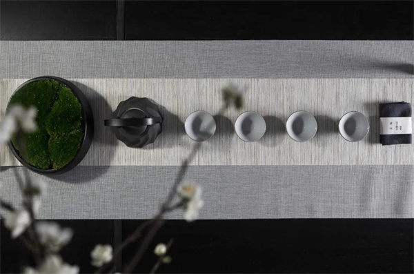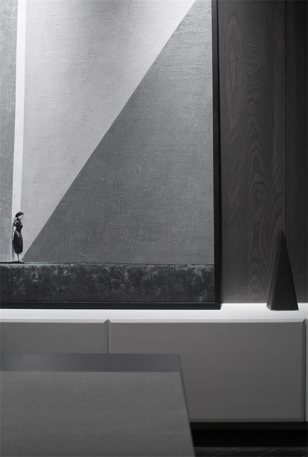 茶室墙面采用浅灰色装饰,保持了视觉的连贯性。墙上挂了一幅抽象艺术画,增添艺术感,却不打破整体的宁静。茶具摆设简约考究,阳光透过白纱窗帘洒入室内,空间显得静谧而通透,是一处既适合独自品茗又适合会客的理想场所。