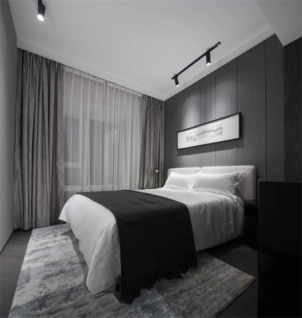 次卧延续了黑白灰的主色调,以简约的设计凸显现代感。简洁的床头背景墙上做了独特的抽象风格设计,与房间的整体氛围完美契合,增添了一抹艺术气息。