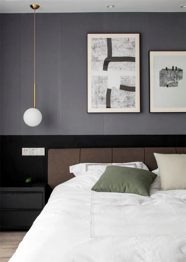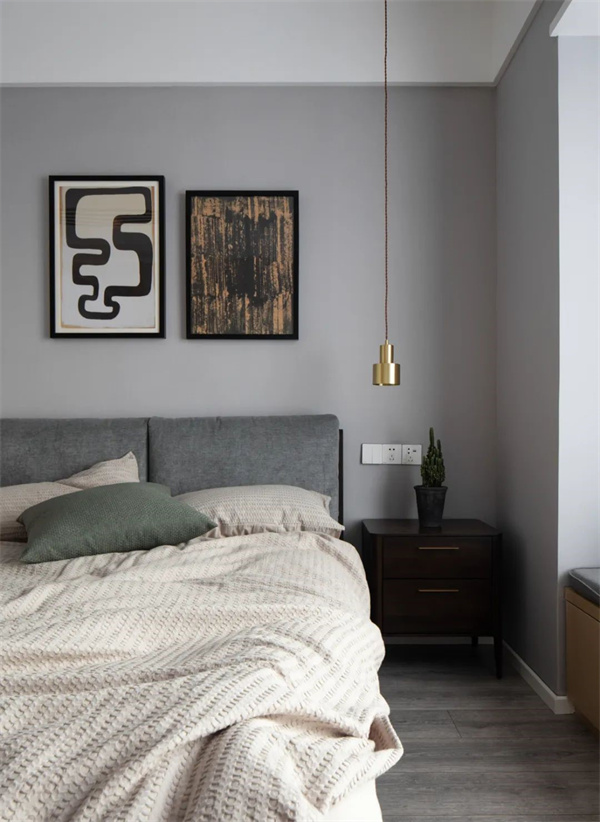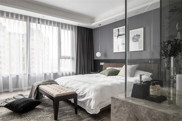 主卧室以灰色为主,地板+墙面、包括床上用品都采用了白+灰组合。床头柜和背景的灰黑组合,为空间增添了一些深色元素。窗帘选用了白色透明面料,确保充足的自然光线进入房间。