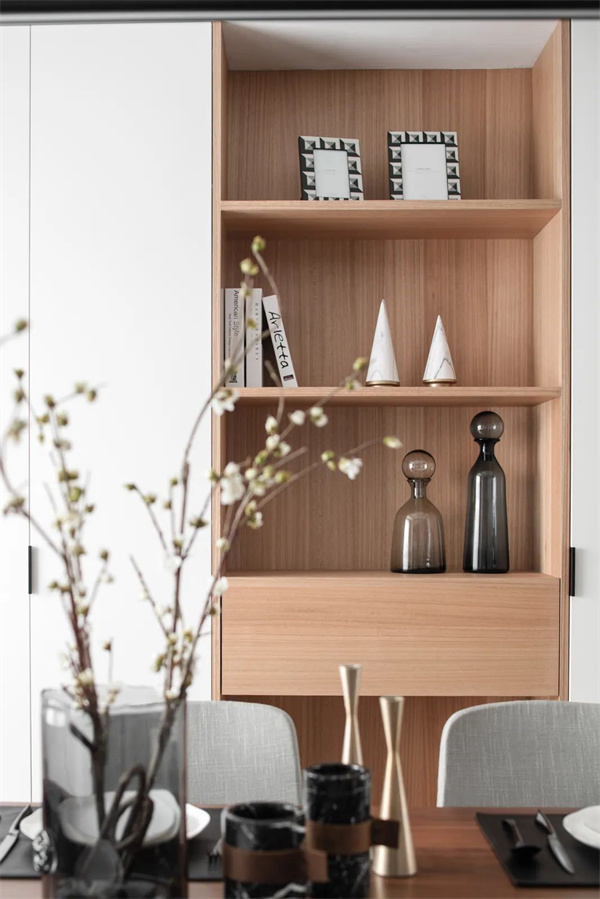 餐厅采用了原木色餐桌和现代风格的椅子,椅背采用灰色织物为用餐区增添了舒适感。顶部悬挂着精致的吊灯,为用餐区提供柔和的照明。餐边柜装饰着一些抽象艺术作品,为空间增添了一抹艺术感。