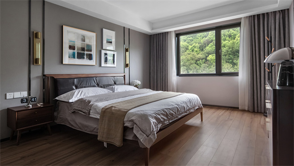 主卧以舒适为设计核心。选择原木色地板、灰白色墙面等柔和的色彩床品和家具,注重舒适度和简约美感。窗帘选用轻薄的材质,让自然光线充分渗透。床头背景墙个性化的装饰品和一组独特设计壁灯,为主卧空间增添一份温馨和艺术感。