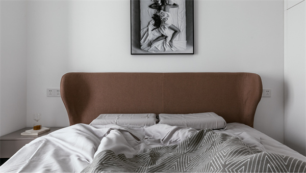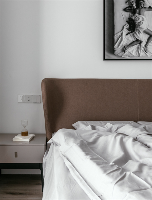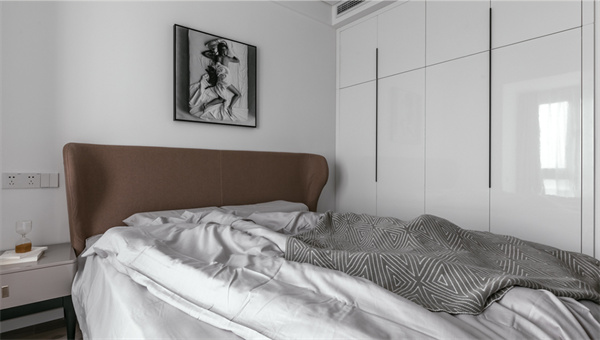 主卧延续了现代简约风格的设计理念,以宁静舒适为主题房间铺设了温暖的原木地板,给人一种自然质朴的感觉。床头背景墙采用白色+灰色挂画的组合设计,既显得沉稳大气,又增加了空间的层次感。