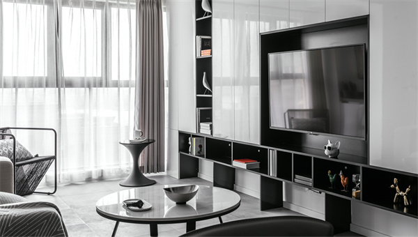 客厅墙壁和天花板都采用纯白色装饰,设计师巧妙地运用了黑白相间的电视背景墙,增添了一丝现代感和视觉层次感。宽大的窗户将自然光线引入室内,中性色的大理石地板为空间增添了质感和豪华感。