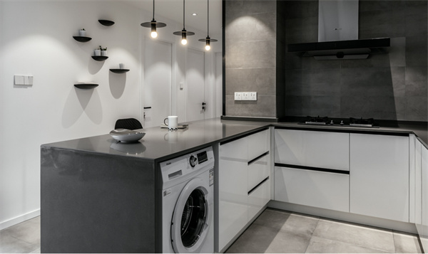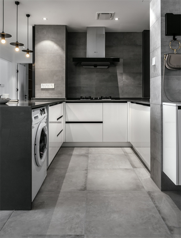 厨房采用半开放式设计的黑白灰配色方案。橱柜选用白色柜面和灰色台面组合,搭配嵌入式电器,创造出极简的外观同时,灰色大理石纹路的地板与墙面,也为厨房增添了质感。