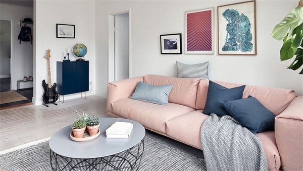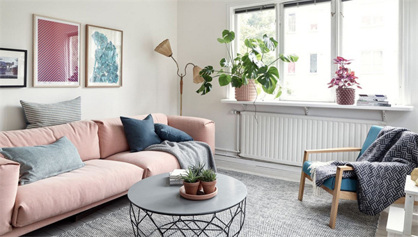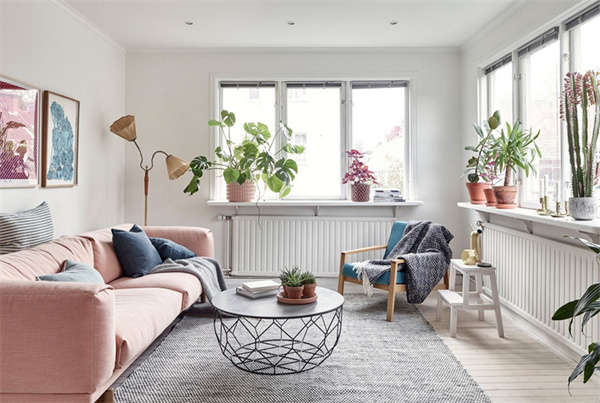 客厅白色的墙面与自然木色的家具相映衬,打造出明亮宽敞的空间。一组粉色布艺沙发与柔软的地毯搭配,营造出舒适宜人的氛围。