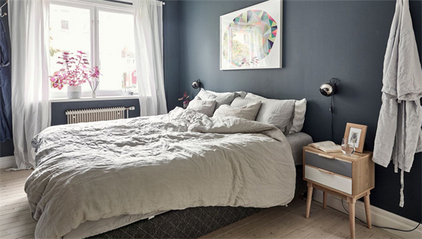 主卧打破传统的沉闷感,选择明亮的白色和淡雅的蓝色组合,搭配原木色的床头柜和家具,营造出轻松宁静的氛围。软装布置由清新的纯棉材质构成,窗帘选择透光的材质,每天清晨都能被温柔的阳光唤醒,开启美好的一天。
