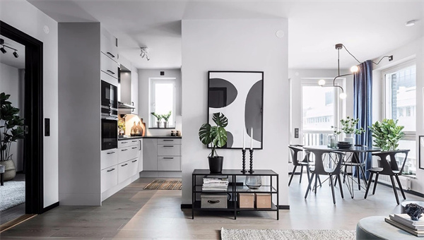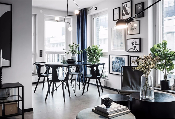 餐厅完美延续客厅的整体基调。深色圆桌和餐椅的设计,加上丰富的绿植点缀为用餐体验增色不少。墙壁上的装饰画营造出艺术氛围,使之成为家人和朋友欢聚美好时光的绝佳场所。