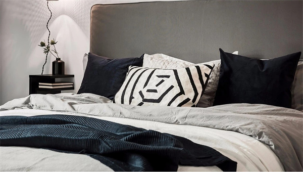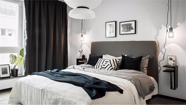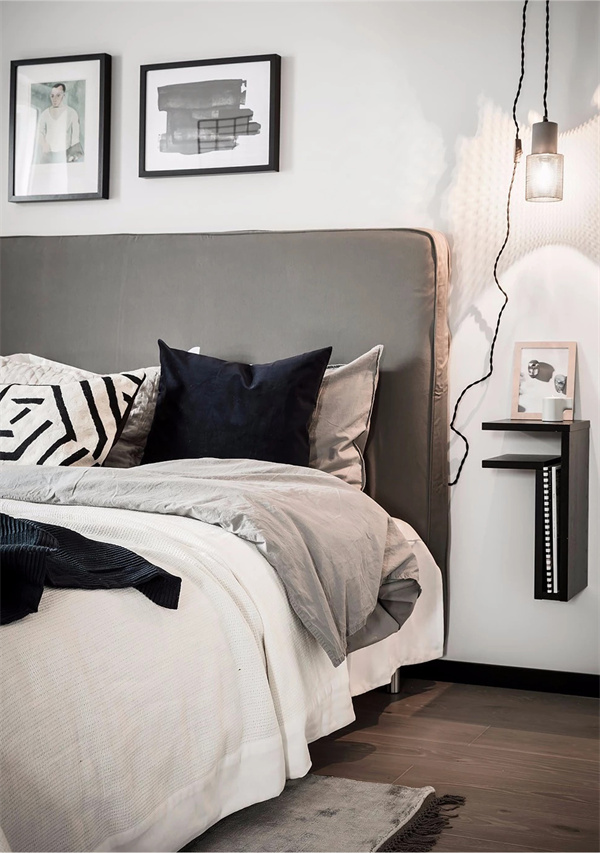 主卧的设计以中性色调为主,家具和床品的选择呈现出极致的舒适感。软装上选用精致的布艺床和纯净的白色床品相搭配,以灰色地毯覆盖地面,同时,床头背景墙的精心设计吸引了视线,为卧室增添舒适和优雅的氛围。
