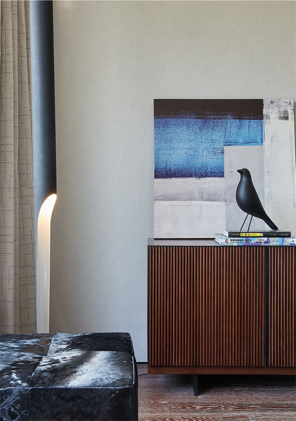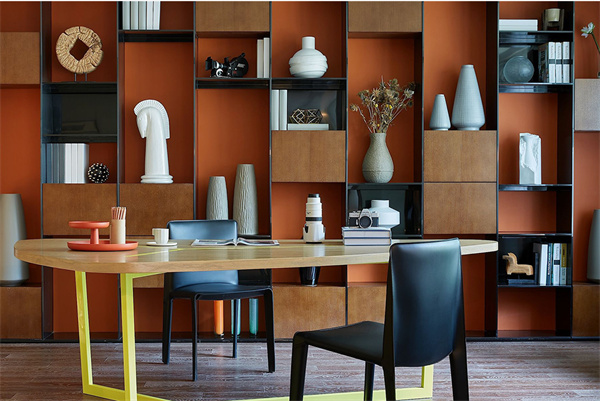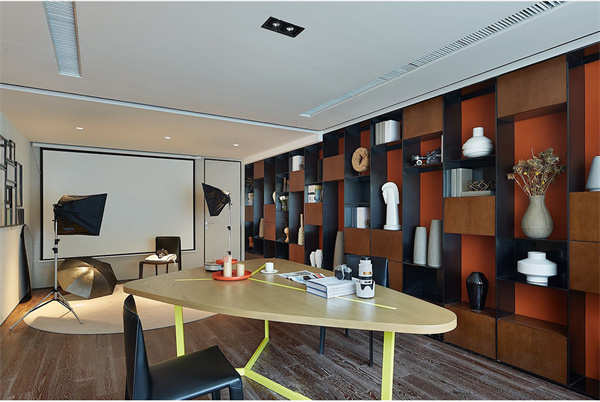 走进书房,被一整排书柜所吸引,大量艺术摆件展示主人品味与艺术素养。加上大量使用的橙色元素,使整个空间更加充满活力和生机,每一处细节都在呼应着整体的设计理念,既独具特色又不失和谐统一。