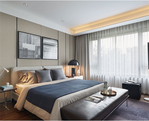卧室床头墙是软质的布艺靠背,整体以灰、白色为基调,加入一组布艺画点缀,带来温暖而又优雅的氛围。床品选用了高品质的纯棉面料,柔软舒适,令人沉浸在舒适的睡眠中。