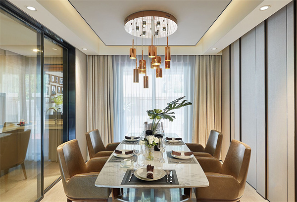 随着空间动线进入餐厅,皮艺餐椅与亮色大理石餐桌的搭配,轻松营造出轻奢优雅的氛围。加上线型黄铜吊灯的运用,让空间既有精致气息又不失温润质感。