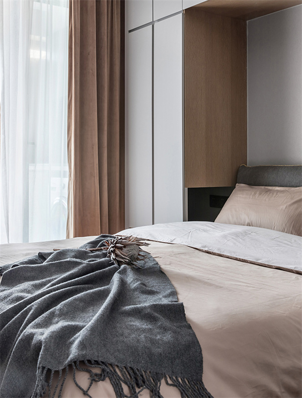 次卧延续整体风格,以白色为主色调,营造出宁静的氛围。墙面和窗帘都是白色+淡灰色组合,一张简约而舒适的双人床与整套原木床头柜设计相配,增添了自然质感。
