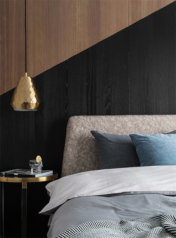 卧室整体布局简洁明快,为休息提供舒适的环境,特别是原木色与黑色相拼接设计的床头背景墙,给整个空间增添了现代感和品味。在优秀的采光条件下,窗帘选用白色透明面料,确保充足的自然光线进入房间。