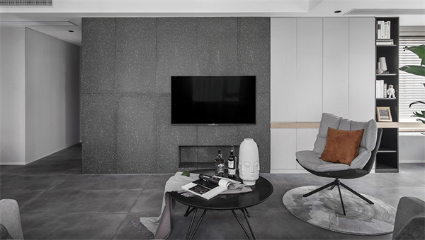 客厅是家庭生活的核心区域,灰白相间的电视背景墙成为空间的焦点。简洁的线条搭配灰色的大理石地板为空间增添了质感和豪华感。加上现代感的设计与白色背景形成鲜明对比,营造出雅致的氛围。