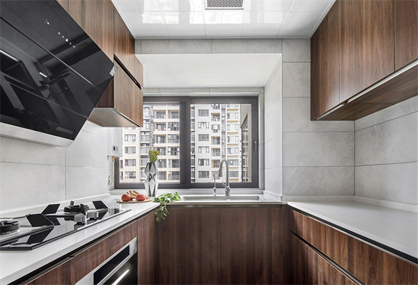 厨房采用现代设计的灰白+原木色搭配方案。橱柜选用原木色柜面和白色台面组合,搭配嵌入式电器,创造出极简的外观。同时,灰白组合的地砖与墙面,也为厨房空间增添了质感。