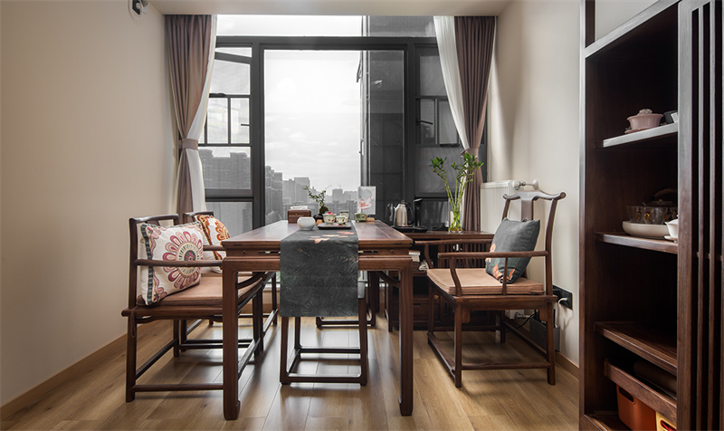 书房深色木质书桌和椅子散发出浓郁的古典韵味,与浅色墙面形成鲜明对比,既庄重又不失温馨。书架的装饰品和绿植点缀其间,为整个空间增添了几分生机与活力。无论是阅读、写作还是思考,这里都能提供一个舒适、专注的环境。