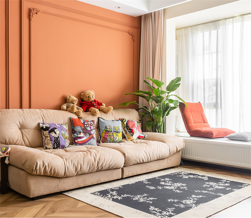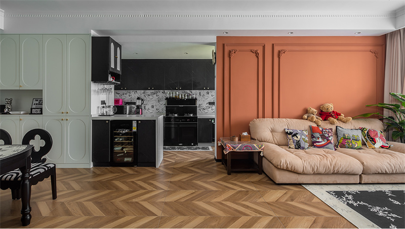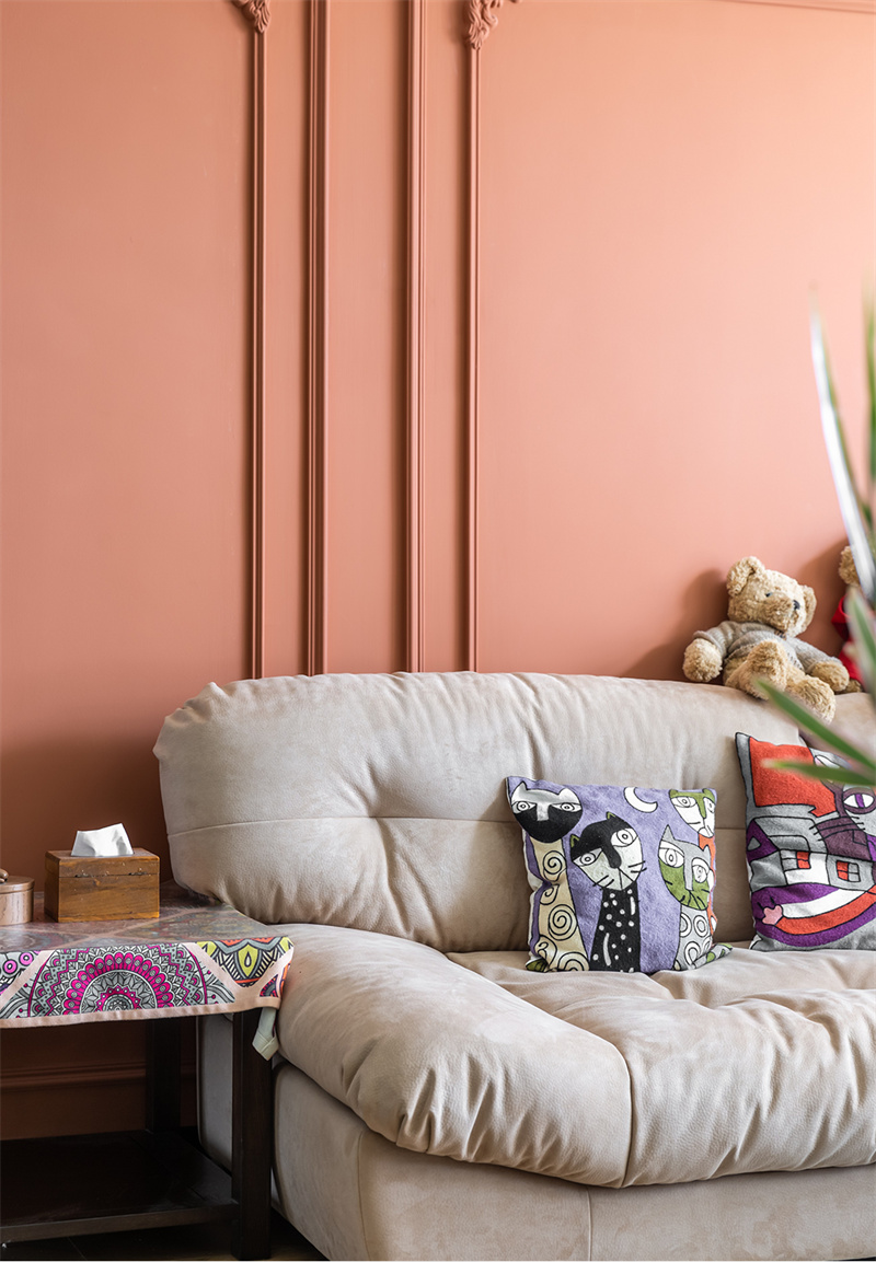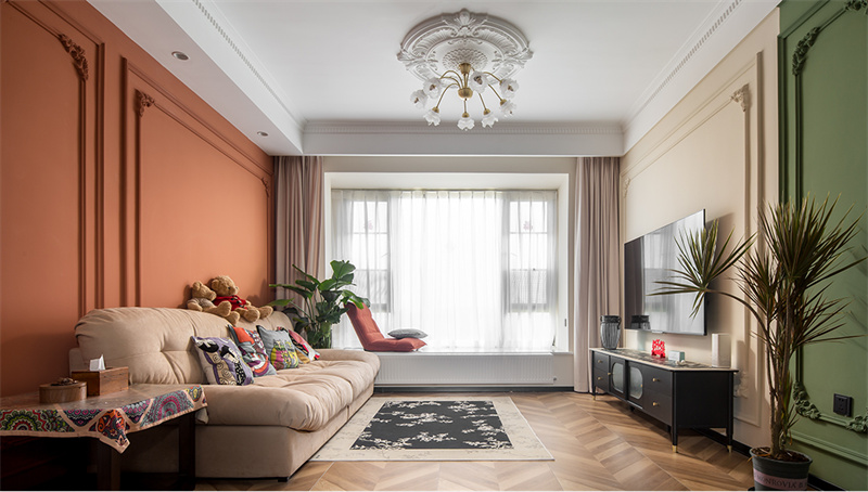 步入客厅,仿佛穿越回了浪漫优雅的法国古典时期。温暖的橙色墙面搭配精致的雕花装饰,整个空间柔和又浪漫,墙面用石膏线做装饰,打破白墙的单调空洞,增加艺术感。