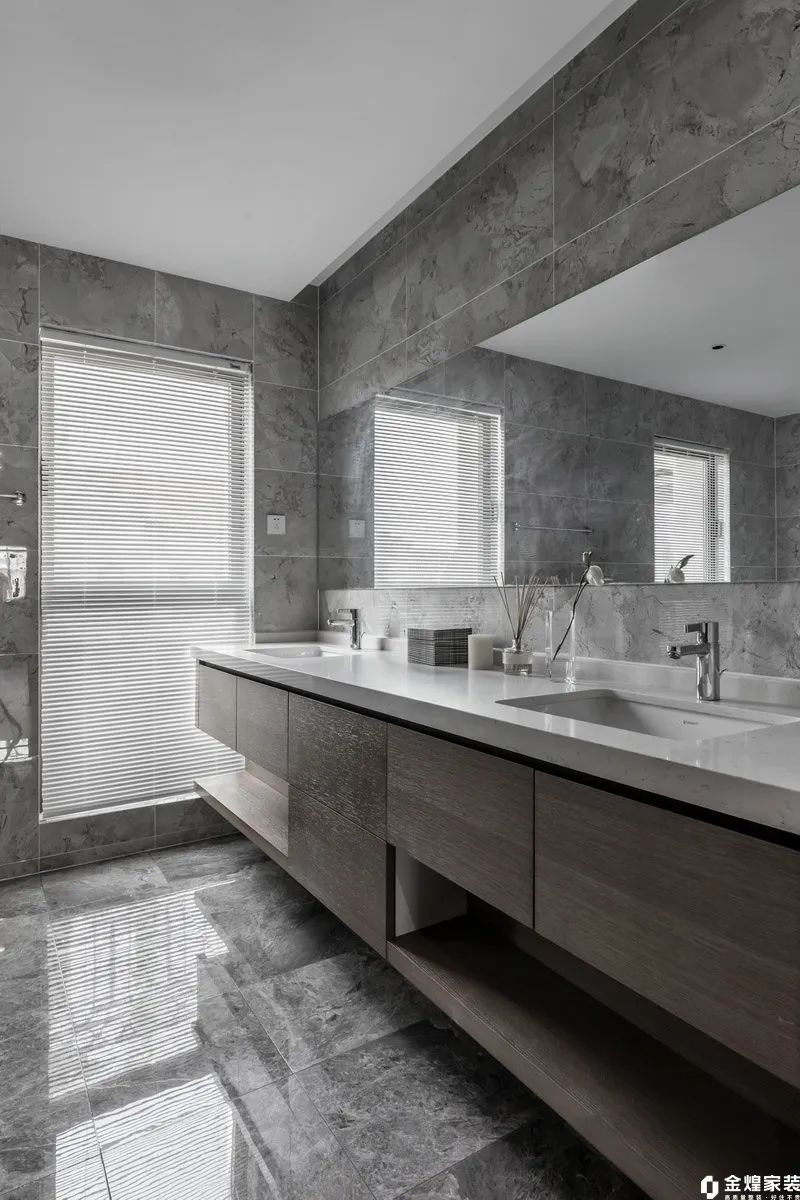 卫生间大面积的镜子与白色台面组合,营造出宽敞明亮的视觉效果;悬空式洗手台设计简洁实用,提供了充足的储物空间。自然光线透过百叶窗洒入室内,增添一份清新与通透感。整体设计既时尚又实用,为日常生活带来舒适与便利。