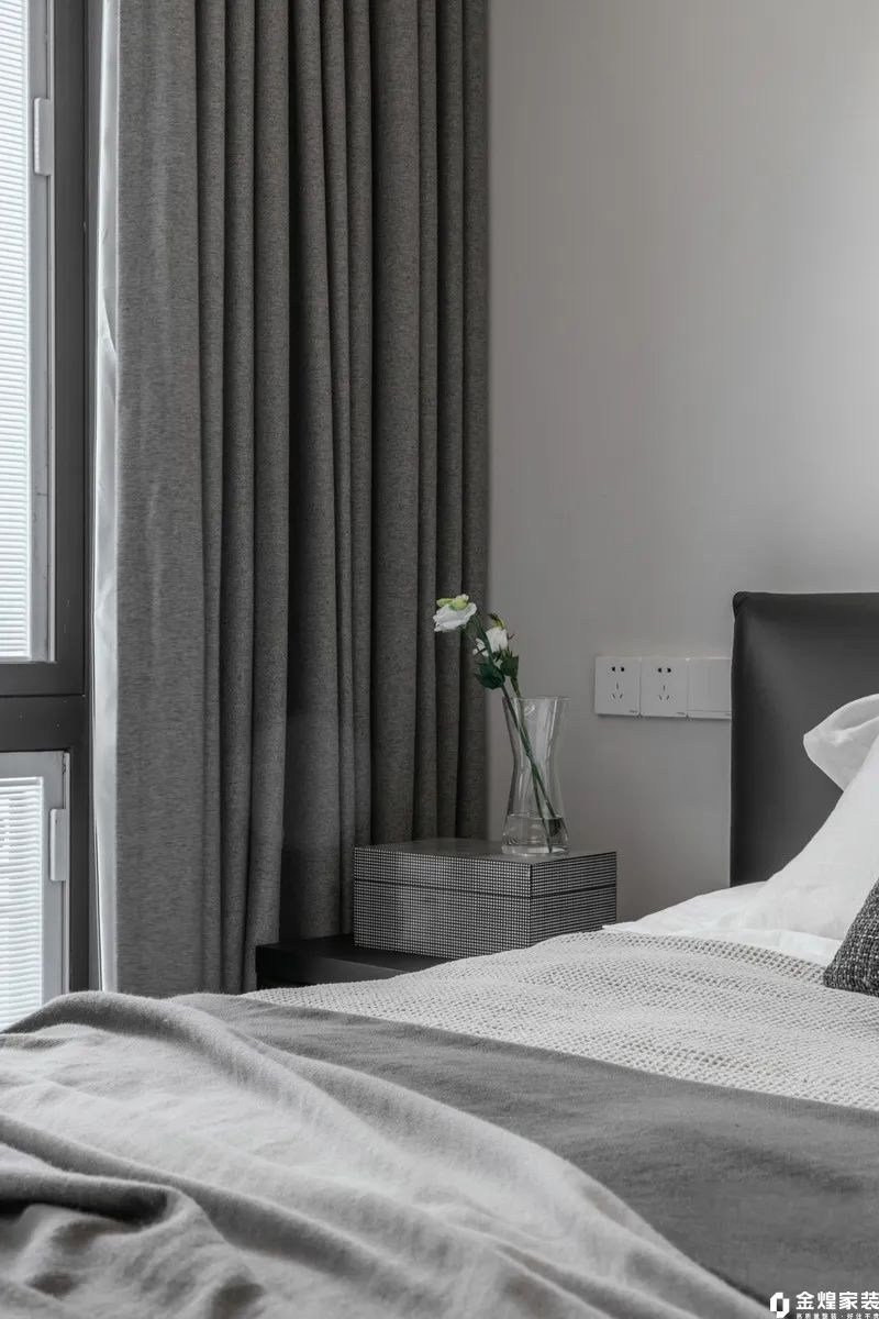 次卧延续了整个住宅的黑白灰现代风格,以淡灰色为主色调,营造出宁静的氛围。墙面和窗帘都是白色+淡灰色组合,一张简约而舒适的双人床与原木书桌和木色地板相配,增添了自然质感。