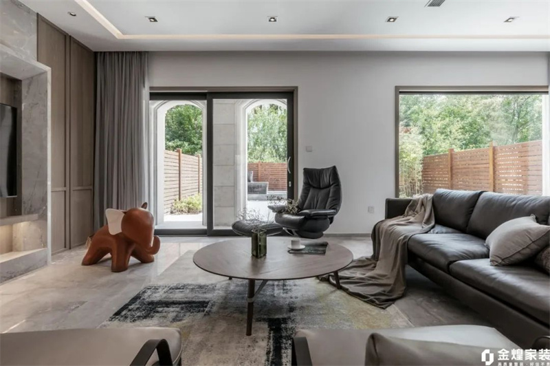 客厅墙壁和天花板都采用了纯白色装饰,营造出了通透的感觉。灰色布艺沙发柔软舒适,搭配黑色皮质单人椅和脚凳,形成鲜明的色彩对比,让整个空间显得更加生动有趣。大理石电视背景墙简洁大方,线条流畅,与整体风格完美融合。