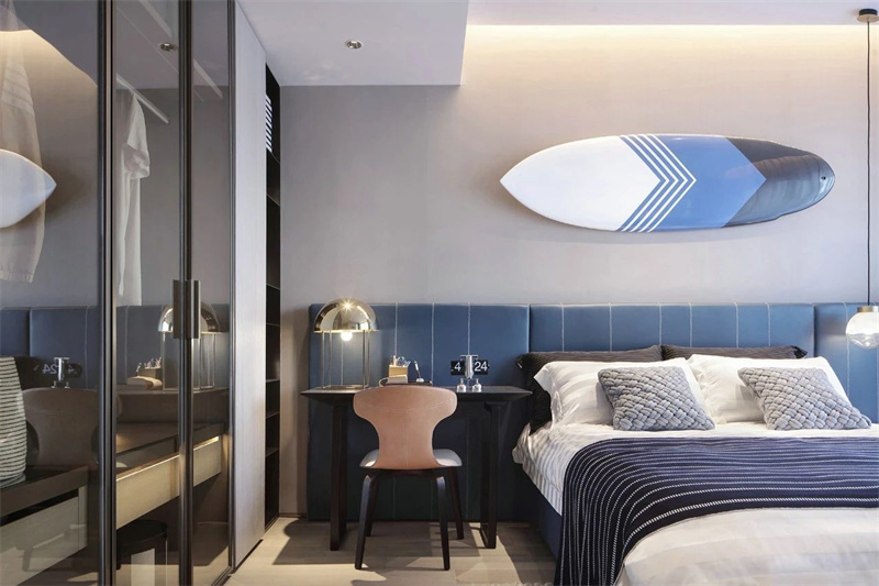 卧室的设计上以简约的线条为核心元素,意式轻奢风在讲述真正的永恒经典。柔和质感灯光设计营造出豪华的感觉,搭配高档质地且色彩柔和的床品,营造出温馨而舒适的睡眠环境。