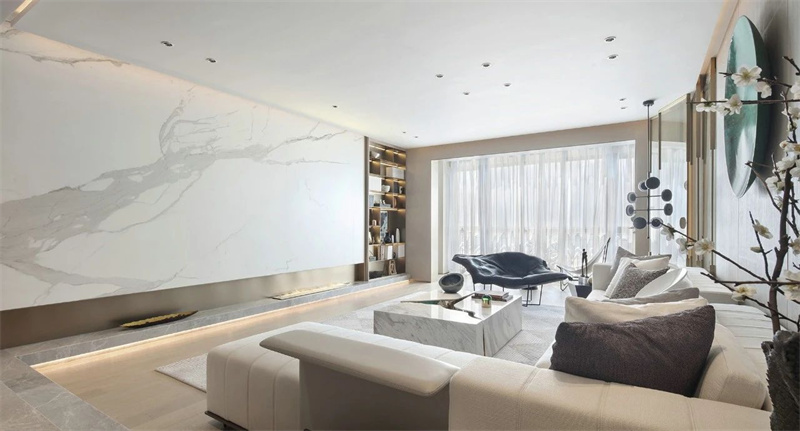 客厅以豪华和舒适为特点,注重细节和艺术品味。大理石地板和墙壁饰面营造出高贵的氛围。精心挑选的艺术品、装饰画和收藏摆件,无不彰显主人对生活品质的追求和艺术品味的独特表达。