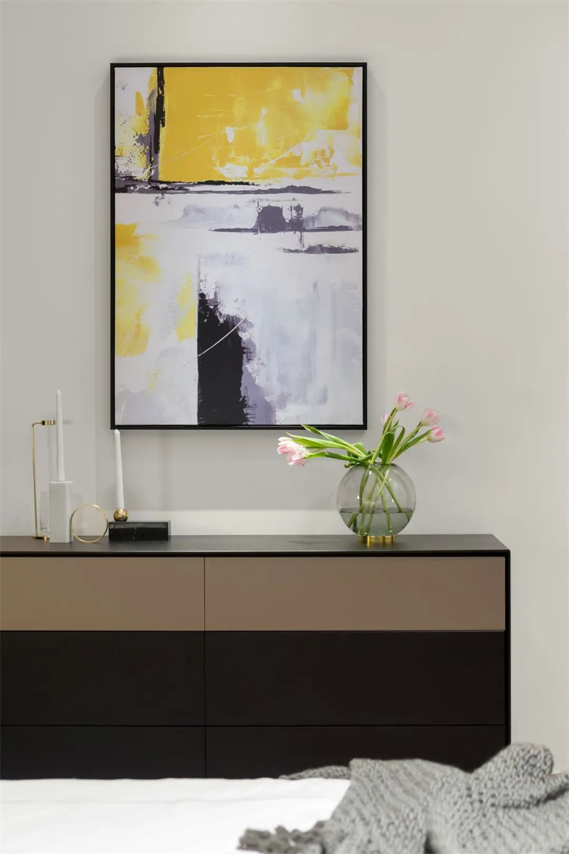 主卧以简洁线条和低饱和色调,营造出宁静舒适的睡眠氛围。落地窗引入充足采光,视野开阔,连接室内外的宁静时光。一侧设置小型工作角,书桌搭配亮色单人椅,兼顾实用与设计感。床头壁灯、香薰与装饰摆件点缀其间,细节中透露着生活温度。