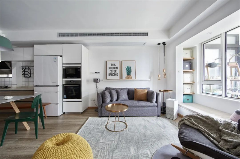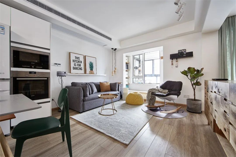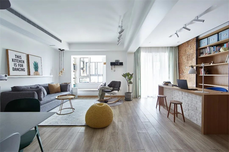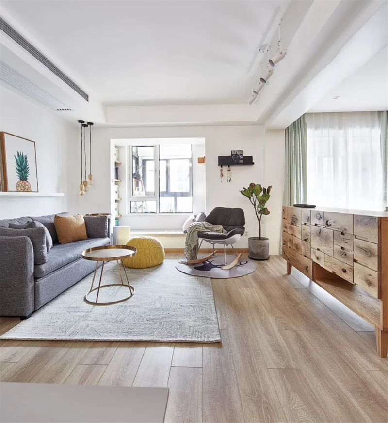 客厅是本案的亮点,白色墙壁为空间提供了明亮的背景。客厅的地板是原木色,赋予了房间自然的温暖感。墙上装饰着一些抽象的艺术画作,为空间带来些许艺术氛围。整个客厅的设计强调了开放感和清晰的线条,让人感到宽敞和时尚。