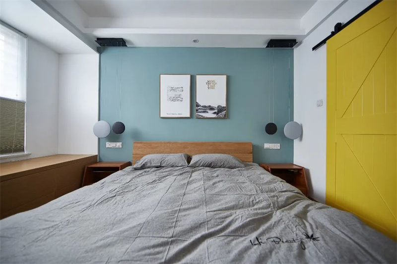 主卧室墙面是明亮的白色,蓝色的床头背景与灰色的床品组合,加上原木地板和实木家具,给空间带来清新的自然感。主卧室的照明设计考虑到了夜间舒适的用光需求,包括床头台灯和壁灯,打造完美的休憩空间。
