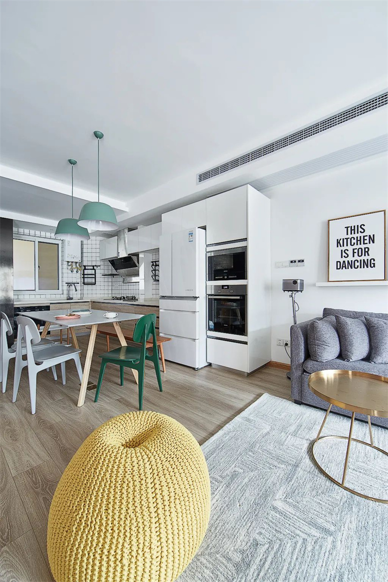 餐厅延续了客厅的设计,使用白色和灰色为主要色调。餐桌采用了简洁的灰白色设计,配合原木色地板,为用餐区带来了舒适感。顶部悬挂着一组现代感的吊灯,为餐区提供了柔和的照明
