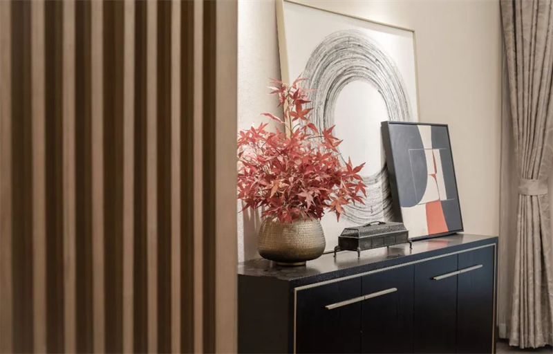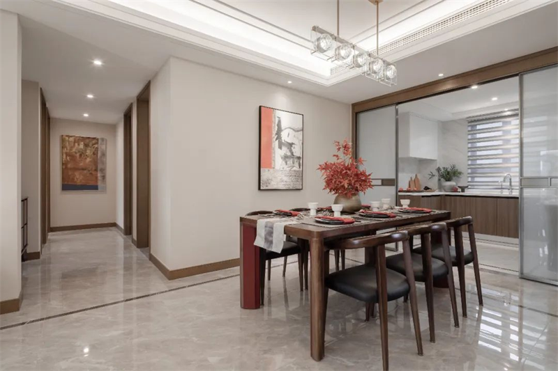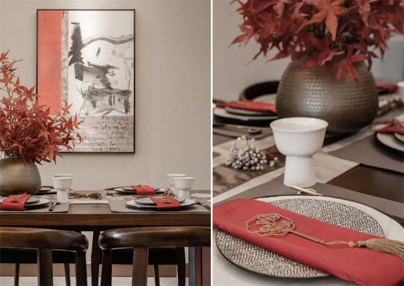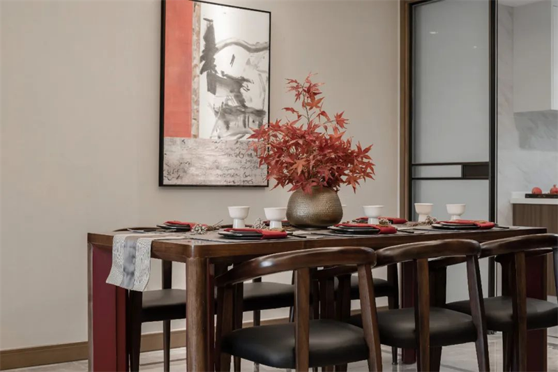 餐厅的餐桌椅采用原木材质,融合传统工艺与简约线条,独具匠心。餐桌上摆放着精致的餐具和红枫盆栽,墙面悬挂着一幅传统水墨风画作,充满东方韵味和现代雅致的装饰细节,让空间散发着独特的魅力。