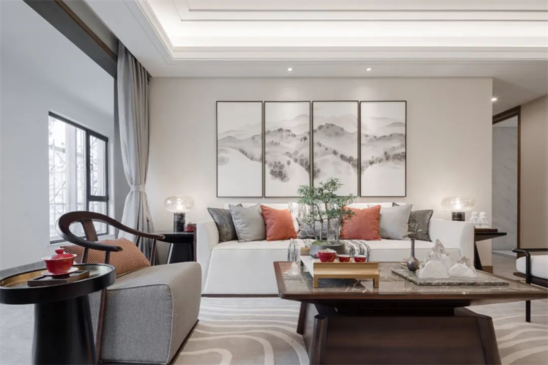 整个客厅以浅色为主调,巧妙地搭配深色家具和传统中式摆件,营造出优雅别致的氛围。中央摆放一张红木茶几,而沙发背景墙则装饰着一组水墨山水画,将宁静和谐的氛围完美呈现。